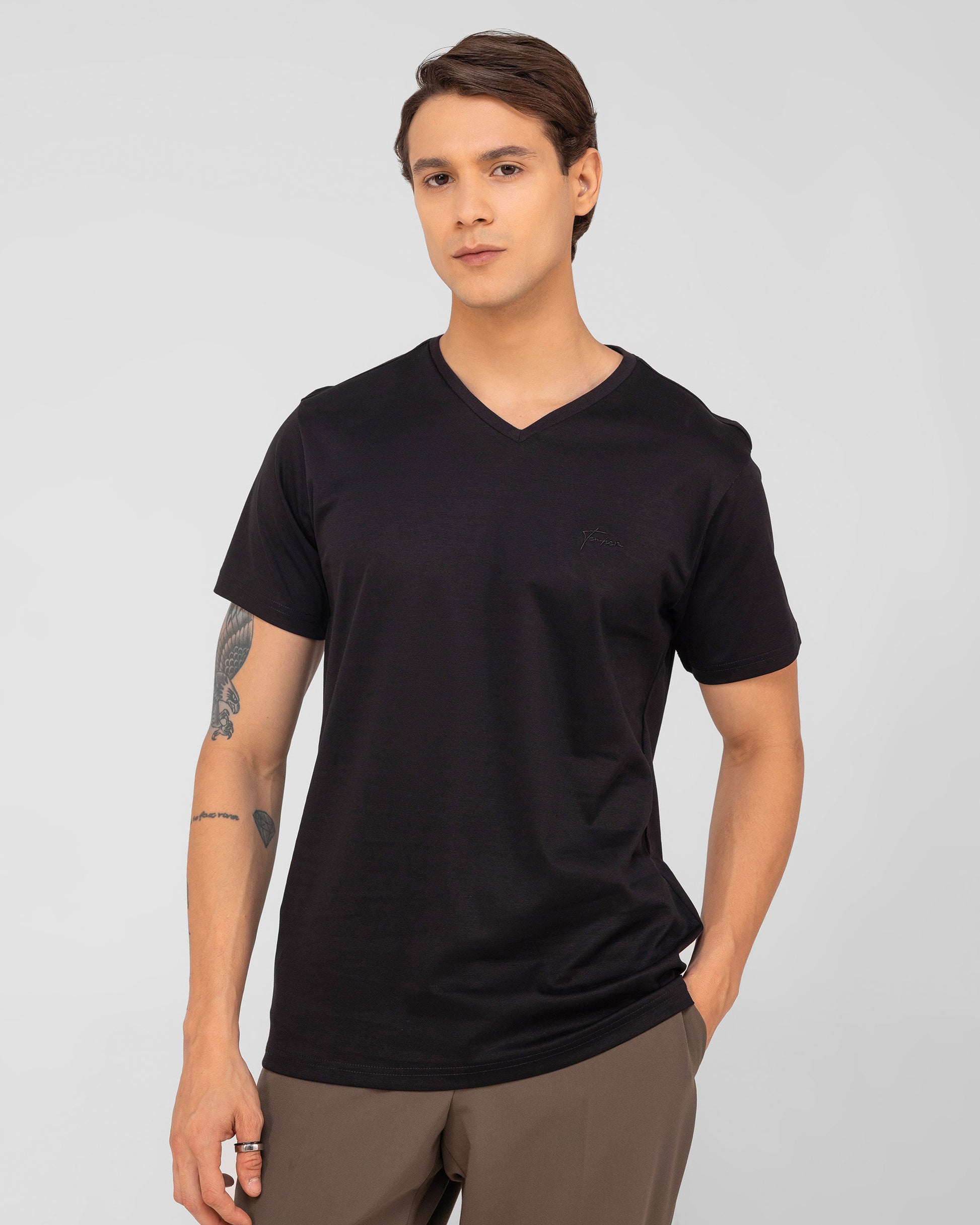 The TENHEM Black V Neck is the epitome of premium craftsmanship, designed for those who appreciate luxury and timeless style. Made with super compact fibers and treated with super mercerisation for a smooth, lustrous pearl finish, this heavyweight 235 GSM V-neck offers unrivaled quality. Its classic fit, enhanced by tonal logo detailing and the signature Tenhem Pique texture, provides sophistication and durability. Perfectly suited for light-tone pairings, this piece from the Luxury Collection ensures a look that is both elevated and effortlessly stylish. A must-have for those who seek the finest in everyday luxury and craftsmanship.